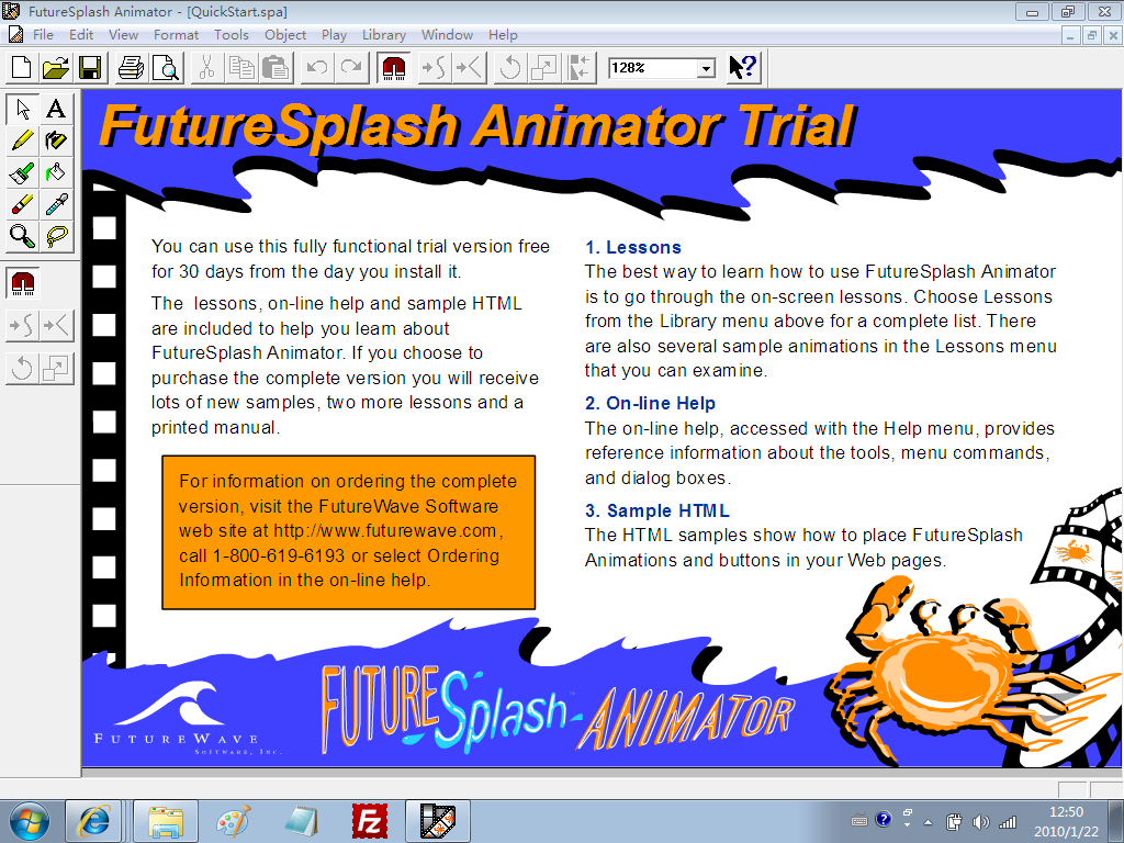 再来一张和Flash MX 2004的对比。 FutureSplash Animator是一个软件产品,用于创建基于矢量的动画。是Flash 的前身。是由FutureWave 软件开发的,其第一个产品 SmartSketch,是一个基于矢量的笔式计算机绘图程序。在 1995 年,该公司决定将动画功能添加到他们的产品,将其部署在新兴的互联网。当时在网站上创建这样的动画的唯一方法是通过 Java 的使用,但是它很快被Netscape的插件体系所取代。在1996年5月 FutureSplash Animator被发布。 当时该技术用在几个大的网站,如微软的 MSN、 辛普森一家的官方网站和迪斯尼网站。在1996年12月 Macromedia 收购了FutureWave,FutureSplash Animator被更名为Macromedia Flash 1.0。 SPL格式的FutureSplash Animator动画在今天仍被Flash Player支持 |